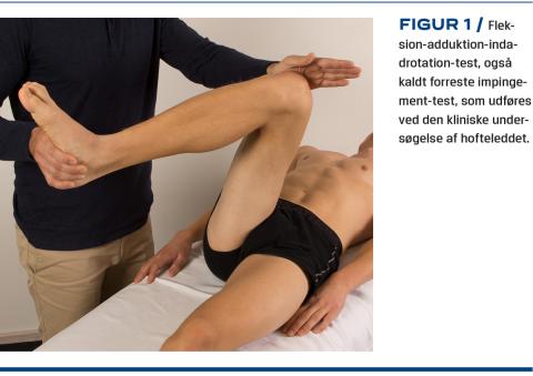 Nedsat bevægelse, typisk indadrotation, findes ved impingement (cam eller pincer) og her som regel med smerter ved fuld fleksion og/eller fuld indadrotation. Patienter med hoftedysplasi har typisk fri bevægelighed og ofte positivt resultat ved test af forreste impingement med fleksion-adduktion-indadrotation (FADIR)-test (Figur 1). Ved nedsat bevægelse i alle retninger må man have mistanke om degenerative forandringer i hofteleddet.