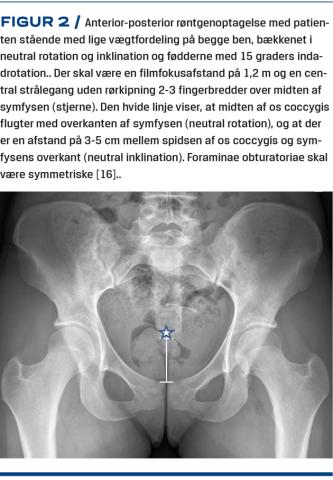Der er et utal af radiologiske målinger til vurdering af hofteleddets morfologi, og der er dårlig evidens for, hvilke man bedst kan bruge til at beskrive morfologien [15]. Forfatterne til denne artikel finder, at i udredning af hofte-lyske-smerter er – ud over anamnesen og den objektive undersøgelse – et standardiseret røntgenbillede af hele bækkenet taget med patienten stående nøglen til at identificere de relevante hofte-/bækkenpatologier (Figur 2), nemlig hofteledsartrose, hoftedysplasi, acetabulærretroversion og pincermorfologi samt i en del tilfælde camforandringer [16].