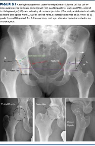 Artrose vurderes efter Tönnis’ klassifikation [17] eller ved måling af lateral ledspaltehøjde (LJSW) [18] (Figur 3). Tönnis grad 2-3 eller ledspaltehøjde < 3 mm er tegn på degenerative bruskforandringer. Acetabulums dækning af caput femoris vurderes med center-hjørne-vinkel (CE-vinkel) og acetabulærindeks (AI). Den normale CE-vinkel er i gennemsnit 35 grader, mens en værdi < 20 grader er udtryk for hoftedysplasi og intervallet 20-25 grader betegnes borderlinedysplasi. AI > 10 grader er udtryk for en stejl acetabulum, hvilket er et element i hoftedysplasi. Acetabulærretroversion betyder, at acetabulums åbning vender mere bagud end normalt, hvilket man får mistanke om, hvis der er posterior wall sign, crossover og ischial spine sign.