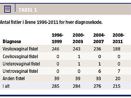 Ifølge Landspatientregisteret blev der i perioden 1996-2011 udskrevet 1.060 kvinder med hoveddiagnoserne: vesikovaginal fistel, cervikovesikal fistel, ureterovaginal fistel, uretrovaginal fistel og »anden fistel mellem urinveje og kvindelige kønsorganer« (Tabel 1). Søgningen viste, at fistler mellem vesica og uterus fortsat er sjældne, på trods af at der if. Sundhedsstyrelsen udføres flere kejsersnit i Danmark end tidligere. Faktisk er der siden 1996 ikke udskrevet nogen kvinder, der har haft vesikouterin fistel som hoveddiagnose. Prævalensen i Danmark er således under det forventelige og imod en tendens, hvor man verden over ser en stigning i de vesikouterine fistler [4]. Det kan være, fordi de ikke opstår på grund af dygtig kirurgi, eller fordi blærelæsioner opdages peroperativt og repareres. Andre muligheder er, at de ikke bliver diagnosticeret, at fistlen mellem blæren og livmodere lukker spontant, eller at kodningen af disse ikke er korrekt, idet man anvender den mere overordnede diagnose: »anden fistel mellem urinveje og kvindelige kønsorganer«.