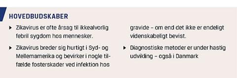Konklusivt har ZIKV været kendt i mere end 50 år, men er nu udbredt til store dele af verden og som noget nyt i store dele af Syd- og Mellemamerika, hvor der p.t. er et stort udbrud i gang. Infektionen er almindeligvis ikke årsag til alvorlig sygdom, men er i sjældne tilfælde relateret til GBS. Fostre er tilsyneladende særligt udsatte ved infektion in utero, og der er påvist en epidemiologisk sammenhæng mellem dette ZIKV-udbrud og forekomsten af mikrocefali blandt nyfødte, ZIKV er også påvist i væv fra enkelte af de misdannede fostre.